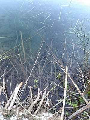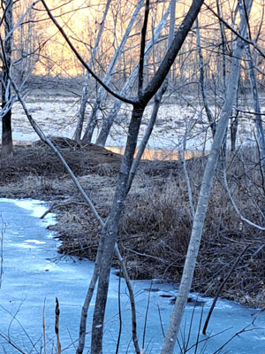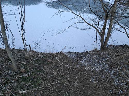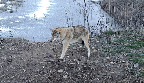 At the next stop we had a blind set where a trail running down the saddle intersected a well used crossover. This spot was successful on beavers and otters last year. With the cold weather the water was iced over on both sides. Coyote tracks were all over the ice. Well the blind set held a nice male coyote. Its toes were still pressing on the pan of the MB 550. The polyfill hadn't even been able to make it out from under the pan, I asked Lane if he wanted to shoot the coyote. He said I could shoot it, this will be important later. I always feel a little tricksy catching coyotes in blind sets but this location wasn't intended for them. If it was I would have used a drag. Being that the trap was anchored in place the blind set was completely torn up. 6 foot circle of churned up dirt. I remade the set as a baited flat set and will set the crossover blind once the ice melts.