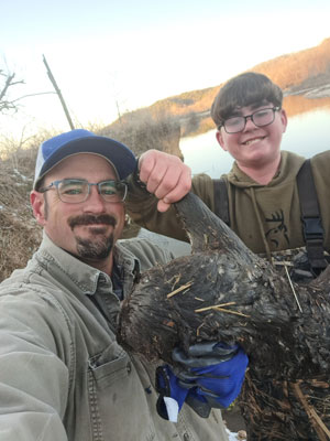 Back to the otter. I hand Lane my 22 pistol and as you can imagine a trapped otter is not a kindly animal. He is trying to line up a shot and I notice that the otter is caught by only one toe in the MB550 offset. I tell him to hurry up because I don't want either one of us needing rabies shots because he didn't shoot fast enough. No sooner than I said that the otter pulls out and is running right towards us. I grab Lane and start hopping, running, trying to fly to the right away from the water. I nearly trip over the remake bucket. As we are moving the otter steers to its right towards the water. The beaver den is right to our left and pretty high above the deep water. Behind us it gets pretty shallow where it feeds the sloughs. As all this moving (and praying) are going on Lane shoots one time. I run my hand down his arm and take the pistol back and scoot over to the creek to try to maybe get the otter taking a breath. It stirred up the mud in the shallow water heading upstream towards the front of the beaver den. As I'm looking I see the weirdest sight. A small trail of bubbles coming straight up from an otter tail! The otter is dead head down in the deep water tail just a few inches under the water. I stand there watching thinking its going to move any minute and I need to be ready to shoot if it nears the surface. After a minute I'm convinced its dead. Its too deep even for waders. I tell Lane to go back to the truck and get the Trappers Pole. He slides into the water as far as he can get in his waders and drops the loop of the Trappers Pole over the top 2 inches of the otters tail and cinch up real tight. It worked! We were able to lift the otter out of the tangle of beaver chewed stick and get it on the bank. We laugh and high five each other. Looking at the otter, the bullet went in just behind the shoulder with a heart lung shot like you would give a deer. I tell Lane he really is like Wyatt Earp. He says I guess I'm going to have to figure out who that is if you are going to keep calling me that. LOL. I guess we are going to have to watch the movie Tombstone this weekend. Needless to say I will be looking at how well the animals are trapped before I give him the pistol again for a while.